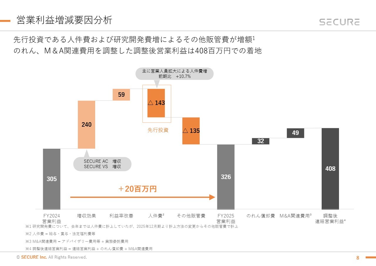 営業利益は3億2,600万円で、前期比6.6パーセントの増益となりました。期初の計画にはやや未達でしたが、これは採用を中心とした人件費の増加など、将来の成長を見据えた先行投資を積極的に行ったことや、M&Aに関連する費用が発生したことが主な要因です。