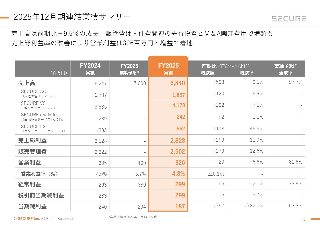 2025年12月期連結業績サマリーをご説明します。売上高は前期比9.5パーセント増の68億4,000万円、売上総利益は前期比11.9パーセント増の28億2,800万円、営業利益は前期比6.6パーセント増の3億2,600万円となりました。経常利益は前期比2.1パーセント増の2億9,900万円、当期純利益は前期比22パーセント減の1億8,700万円となりました。
