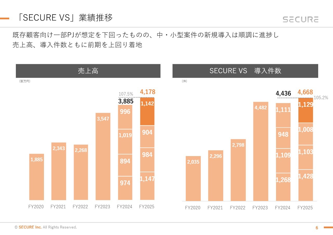 監視カメラシステムの「SECURE VS」についてです。既存顧客向けの一部プロジェクトでは進捗が想定を下回りましたが、フィジカルセキュリティに対する堅調な需要を捉え、中小型案件の新規導入は順調に推移しました。その結果、売上高と導入件数はともに前期比で増加しました。