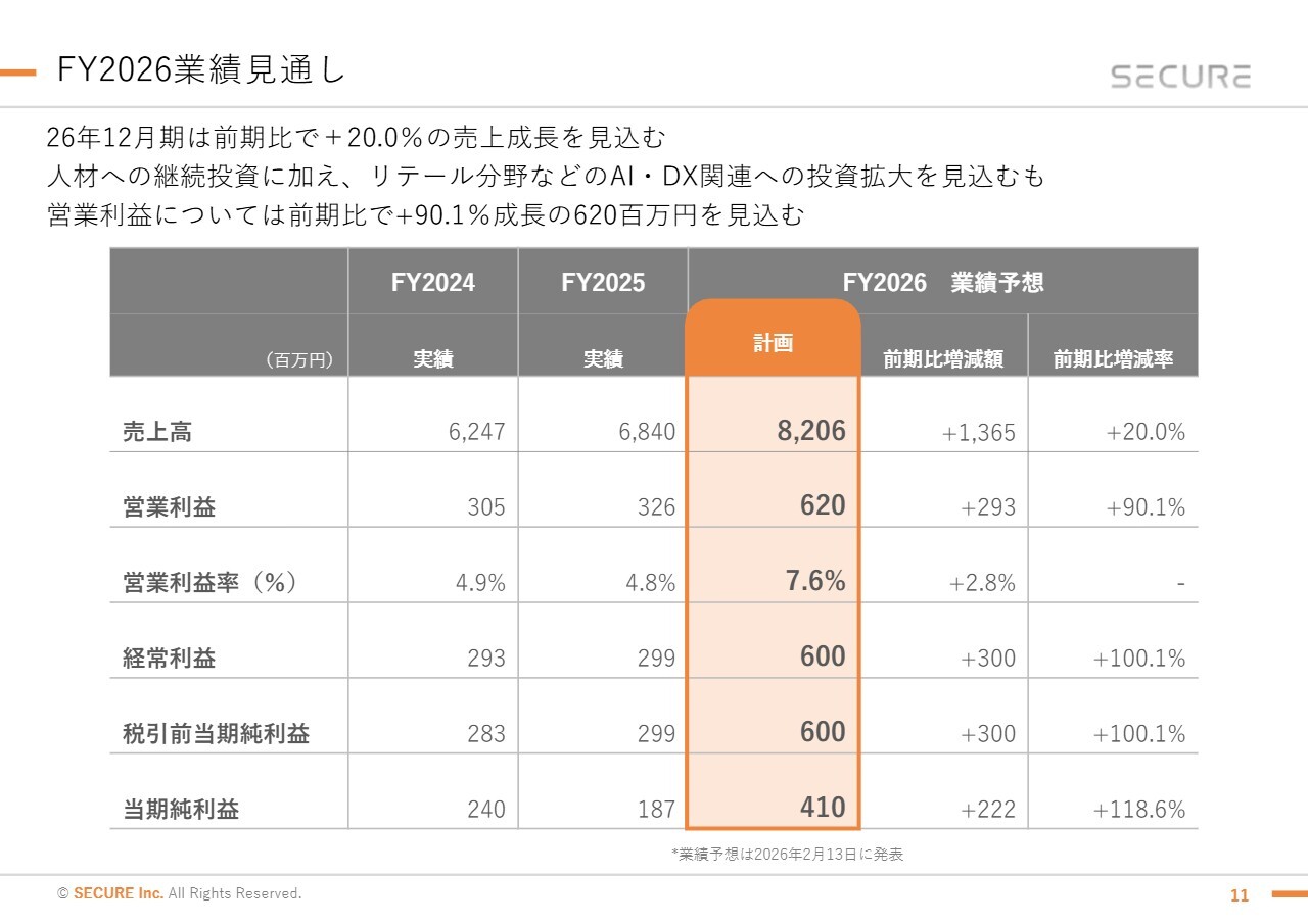 2026年12月期の業績見通しについて詳しく説明します。売上高は前期比20パーセント増の82億600万円、営業利益は前期比90.1パーセント増の6億2,000万円となり、営業利益率は7.6パーセントと徐々に向上しています。今後も営業利益率の改善を図りながら、成長を目指していきます。