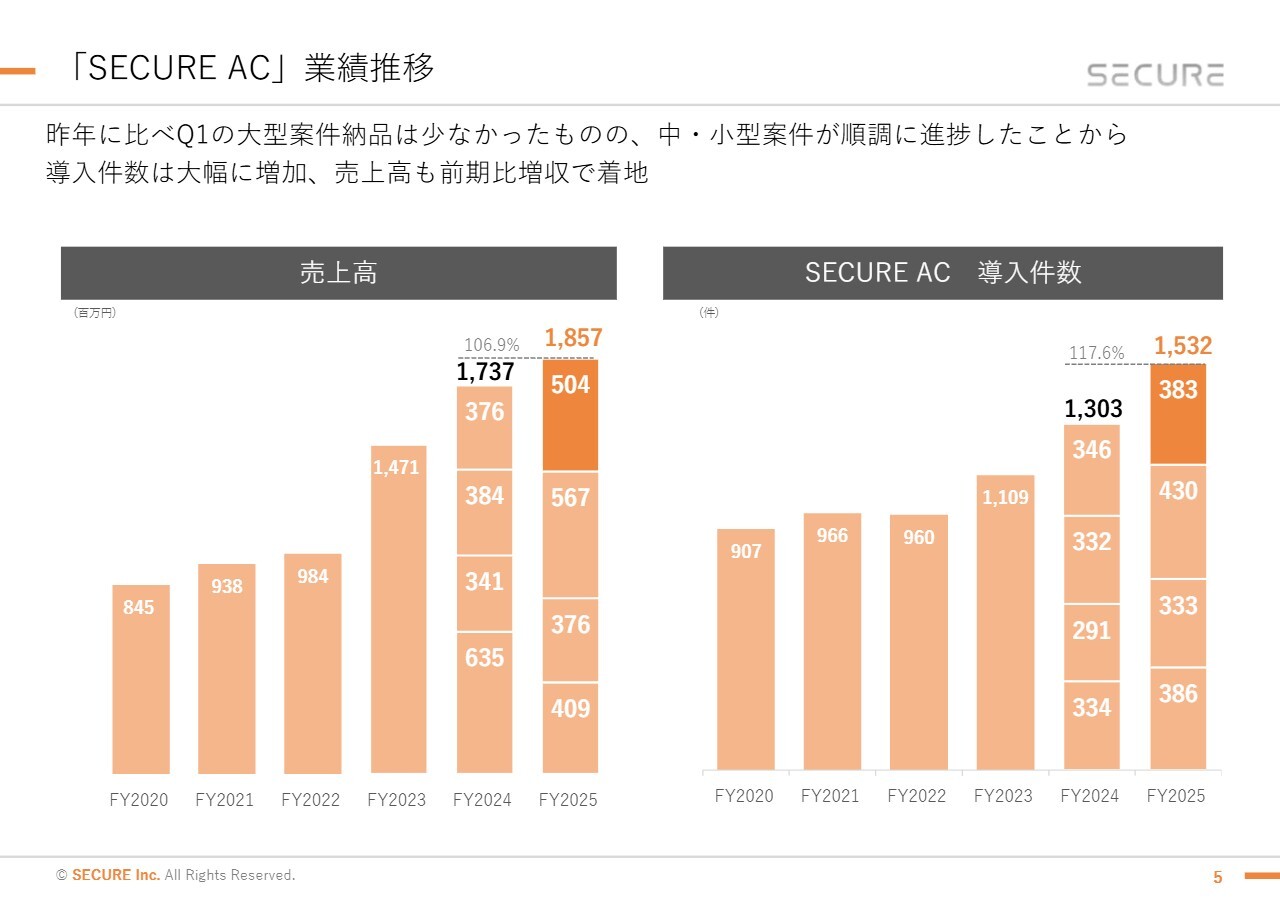 続いて、個別のサービスの事業推移についてご説明します。まず、入退室管理システムの「SECURE AC」です。売上高は、昨年と比べて第1四半期に大型案件の納品が少ない状況でしたが、中小型案件を中心に順調に進捗したことで導入件数が大幅に増加しました。その結果、売上高も前年同期比で増収となりました。