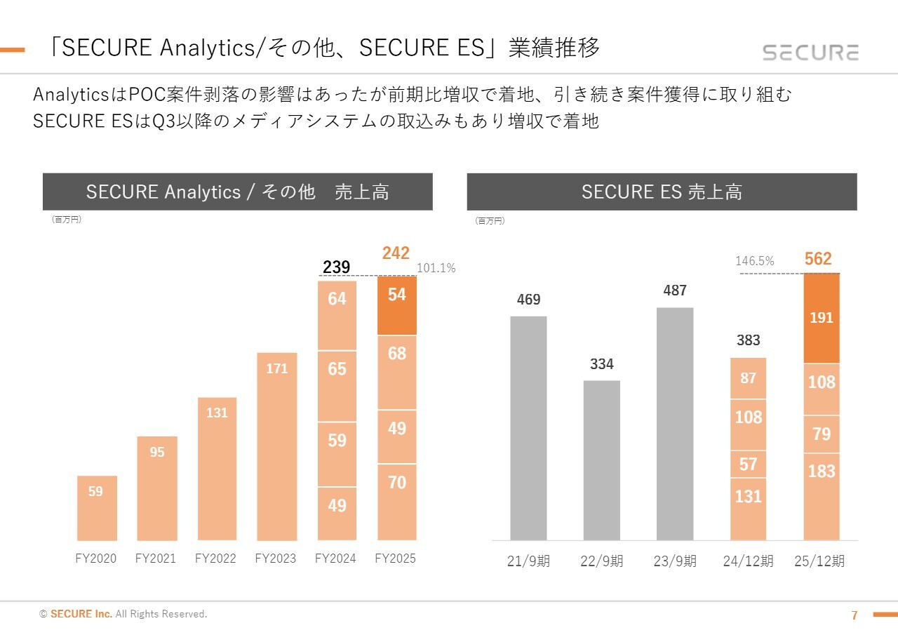 「SECURE Analytics/その他、SECURE ES」についてです。「SECURE Analytics」は、PoC案件の剥落という影響がありましたが、前期比では増収で着地しました。引き続き、AIやDXに関する旺盛な需要を取り込み、案件の獲得に努めていきます。
