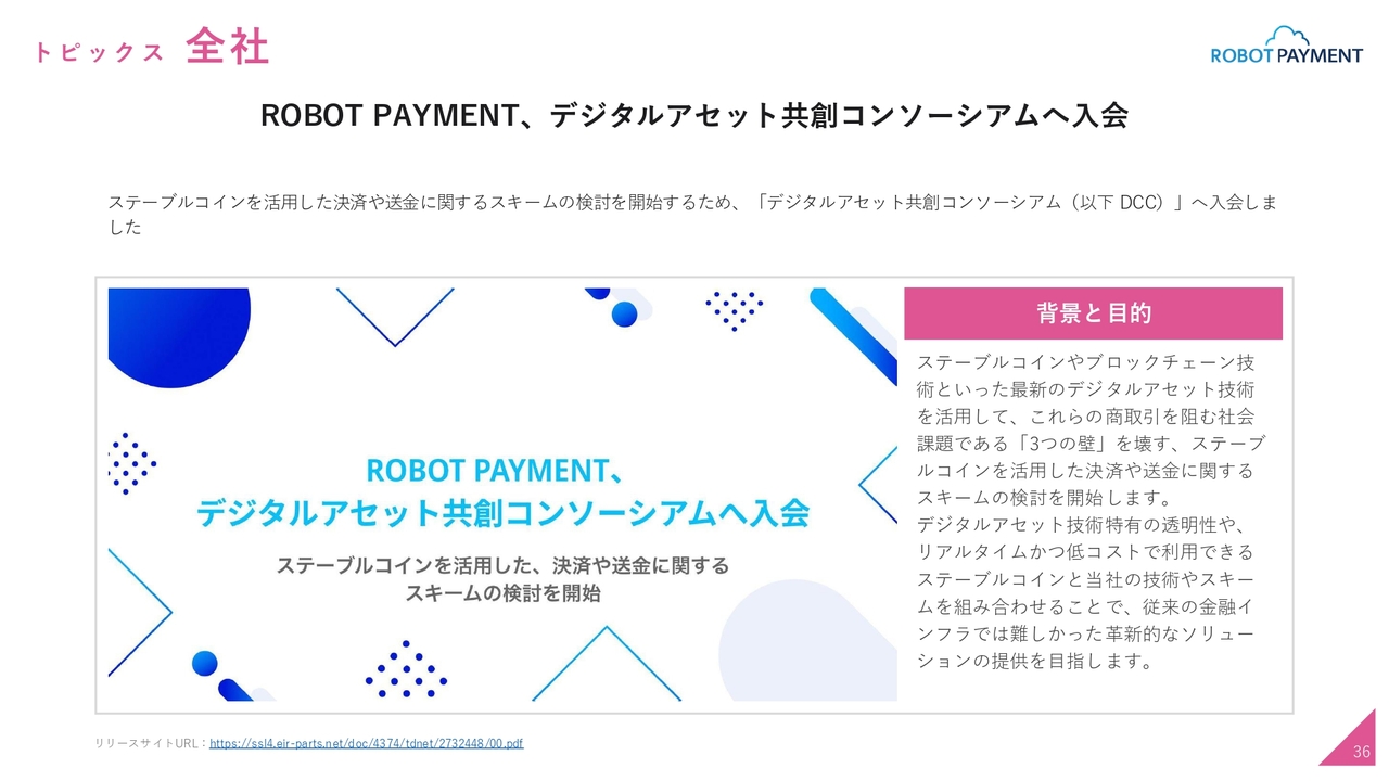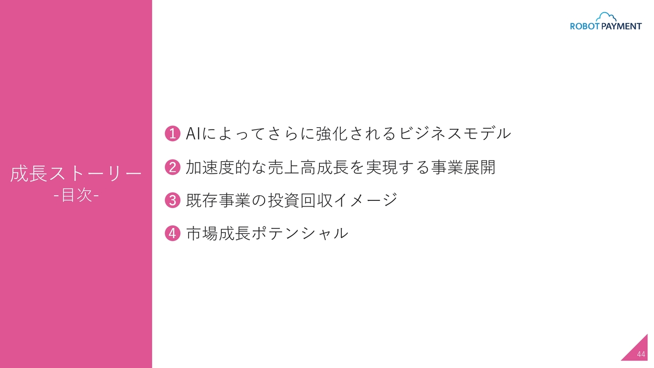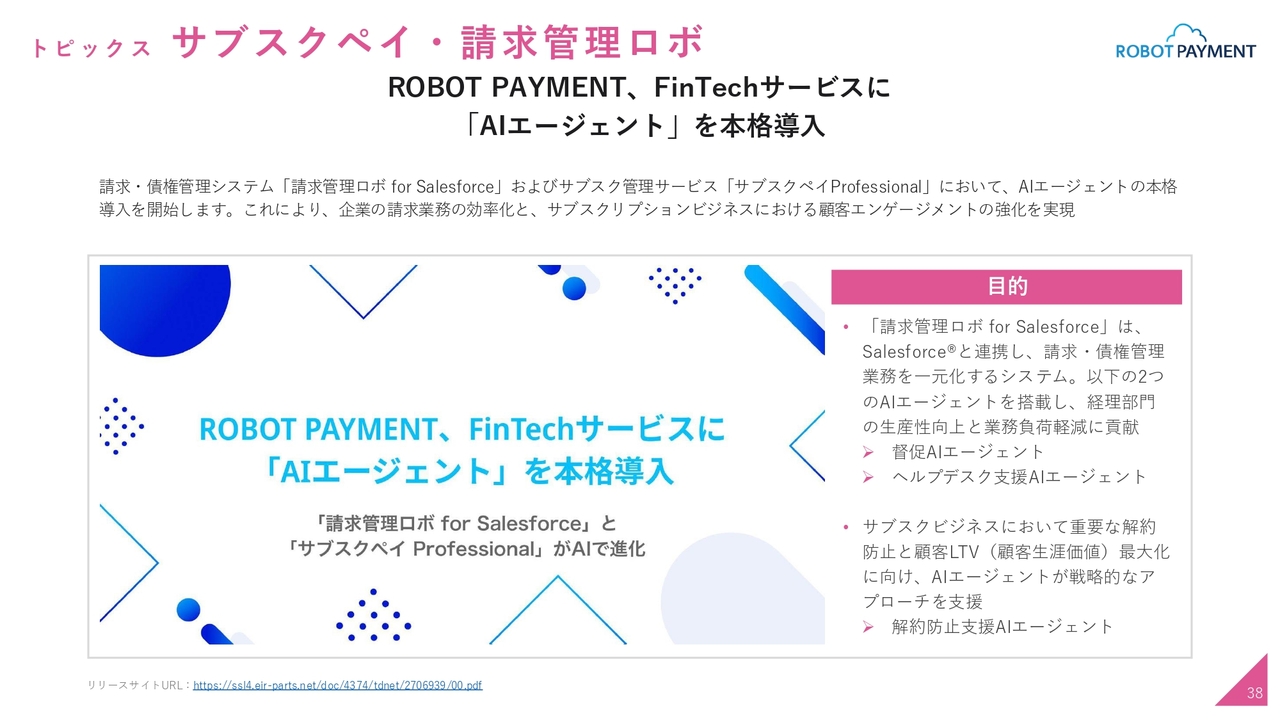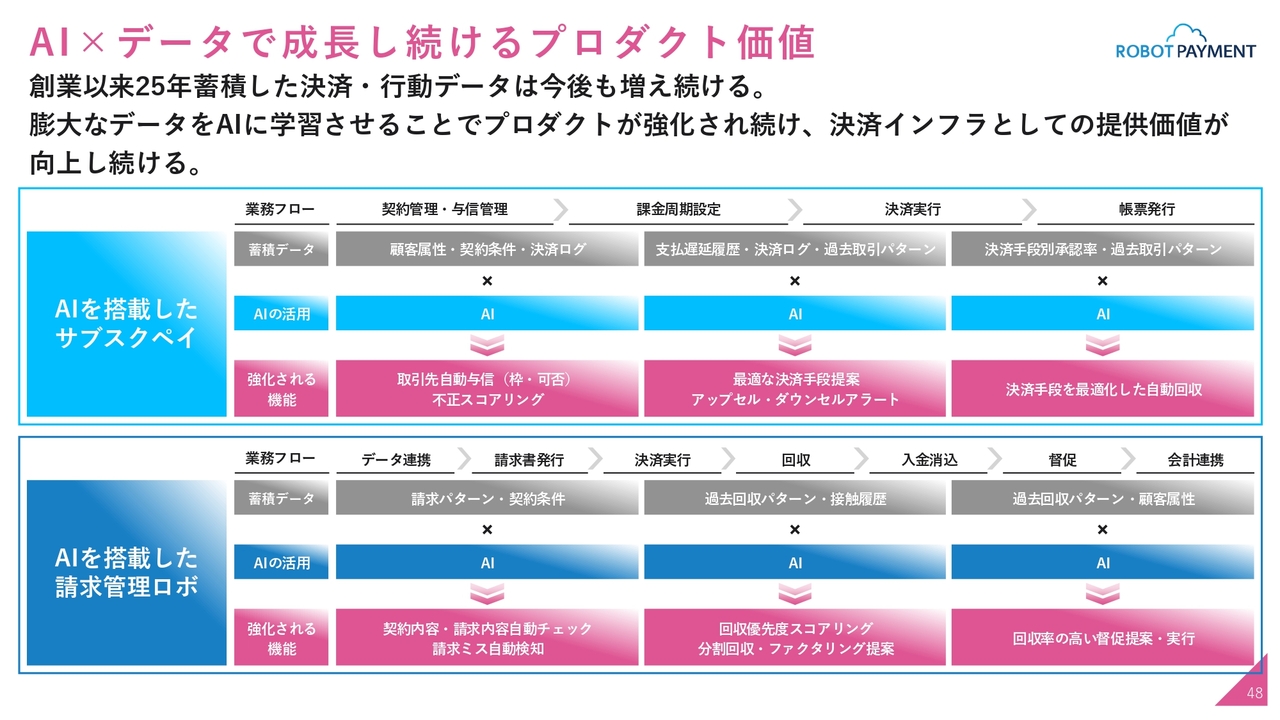 スライドに、「ROBOT PAYMENT、FinTechサービスに『AIエージェント』を本格導入」と書かれていますが、まずスタートとして、AI時代において当社のプロダクトはAIと連携することでさらに強化されていく流れがあります。