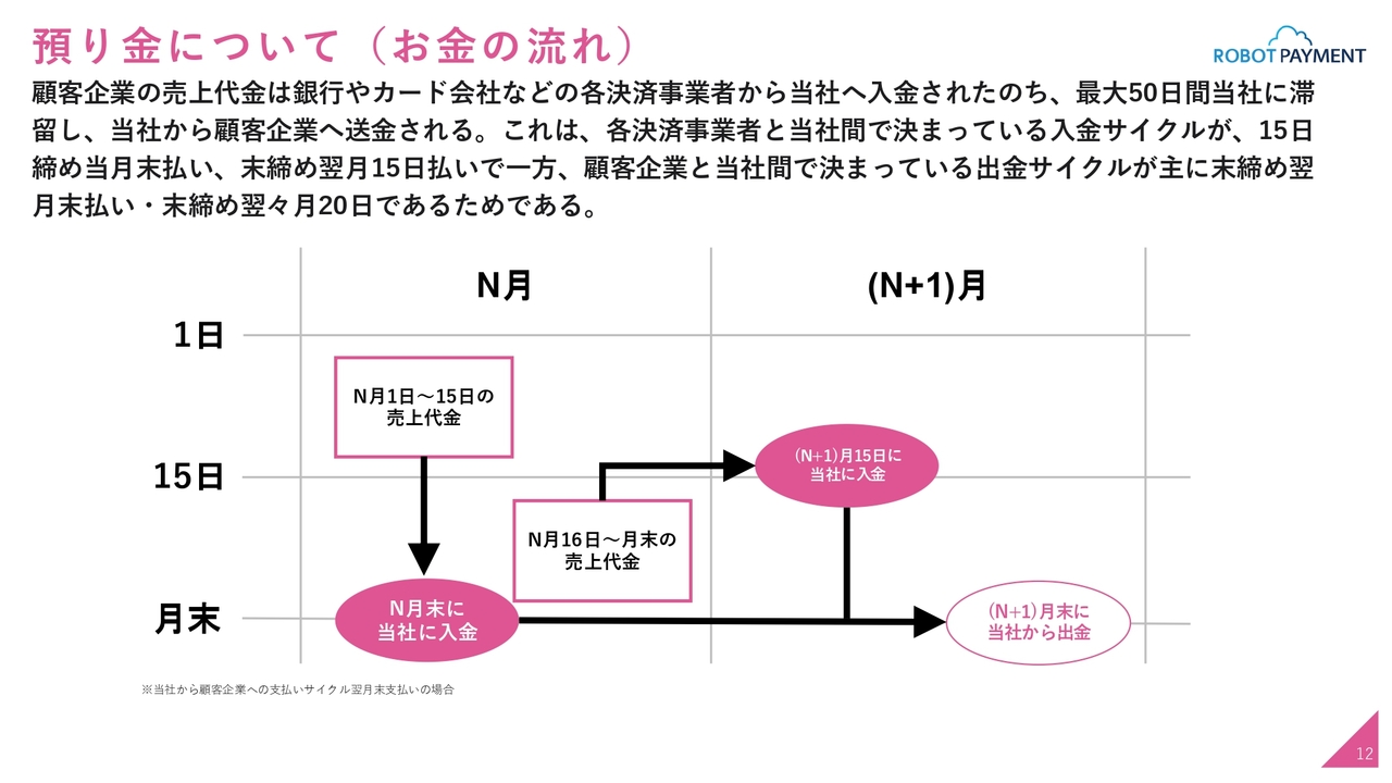 その背景について、スライドでご説明しています。具体的には、各決済事業者と当社の間で決定している入金サイクルが、当社とお客さまの間で決まっている出金サイクルよりも基本的に早いことに起因します。そのため、一定期間お客さま企業のお金を当社が預かるかたちとなり、これが預り金の発生要因となっています。