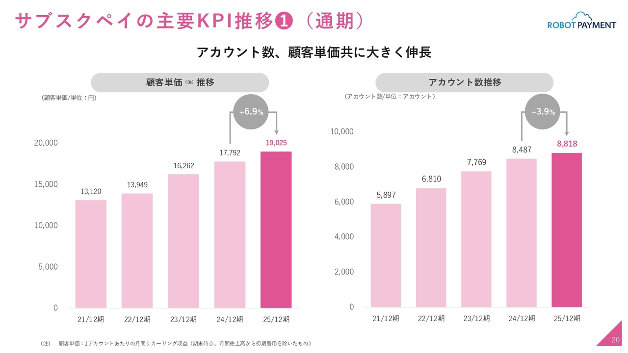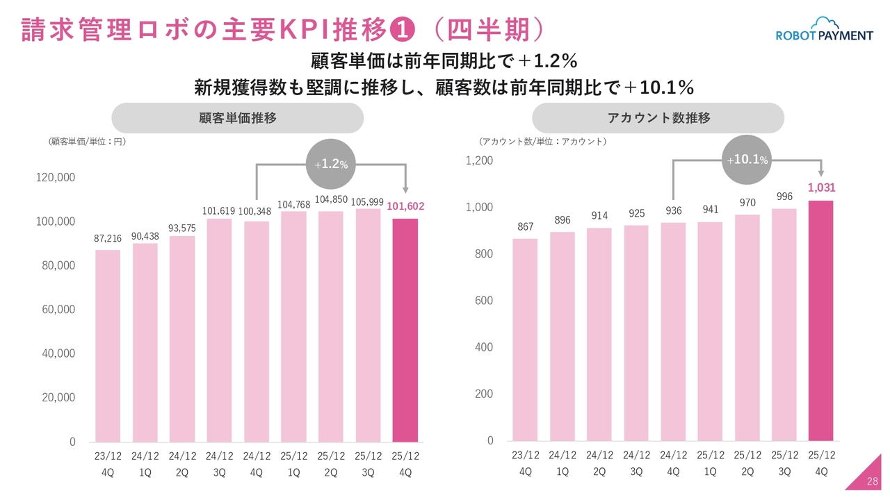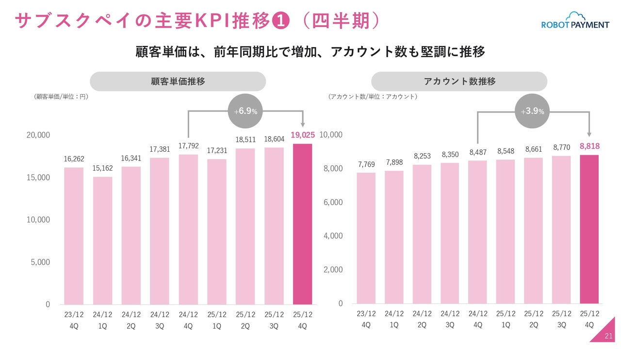 年度ベースで見ると、顧客単価とアカウント数ともに順調で、特にアカウント数の成長がやや回復し、再び2桁成長に戻っています。