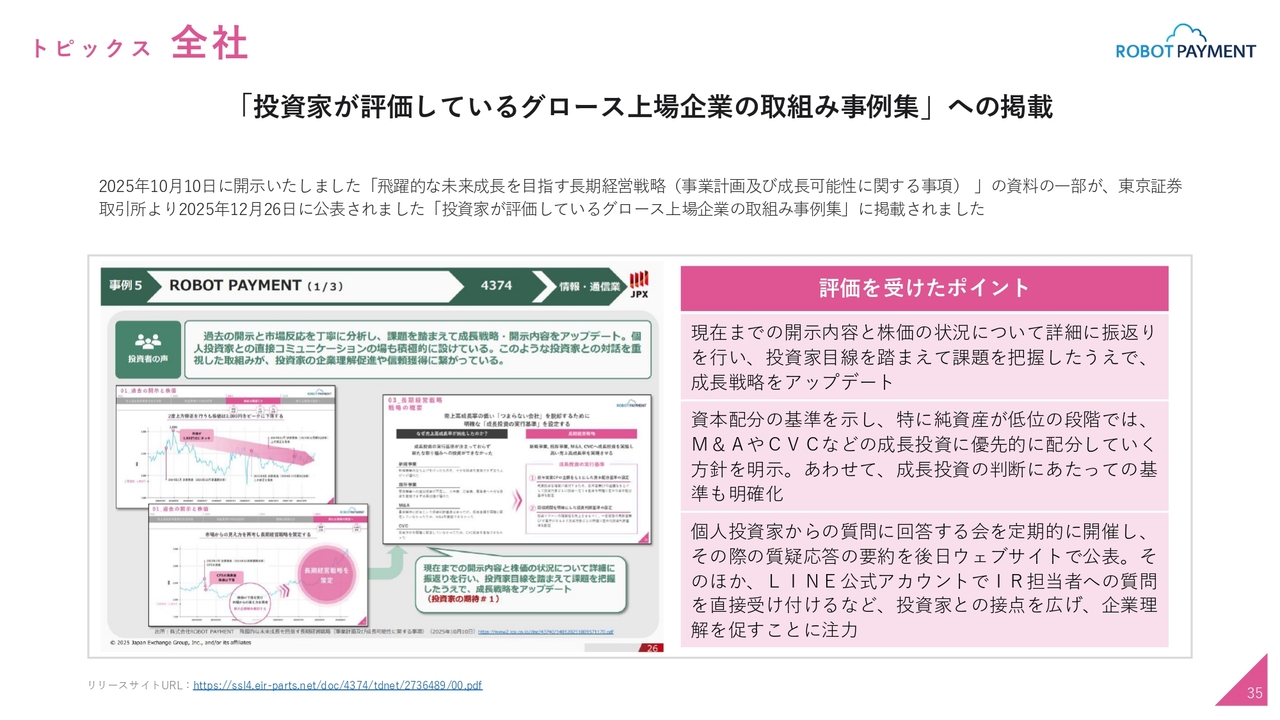 スライドは、東証が「よい開示をしている会社」として事例に挙げたものです。当社はグロース市場として選ばれました。今後も投資家のみなさまにわかりやすい開示を続けていくことを考えています。