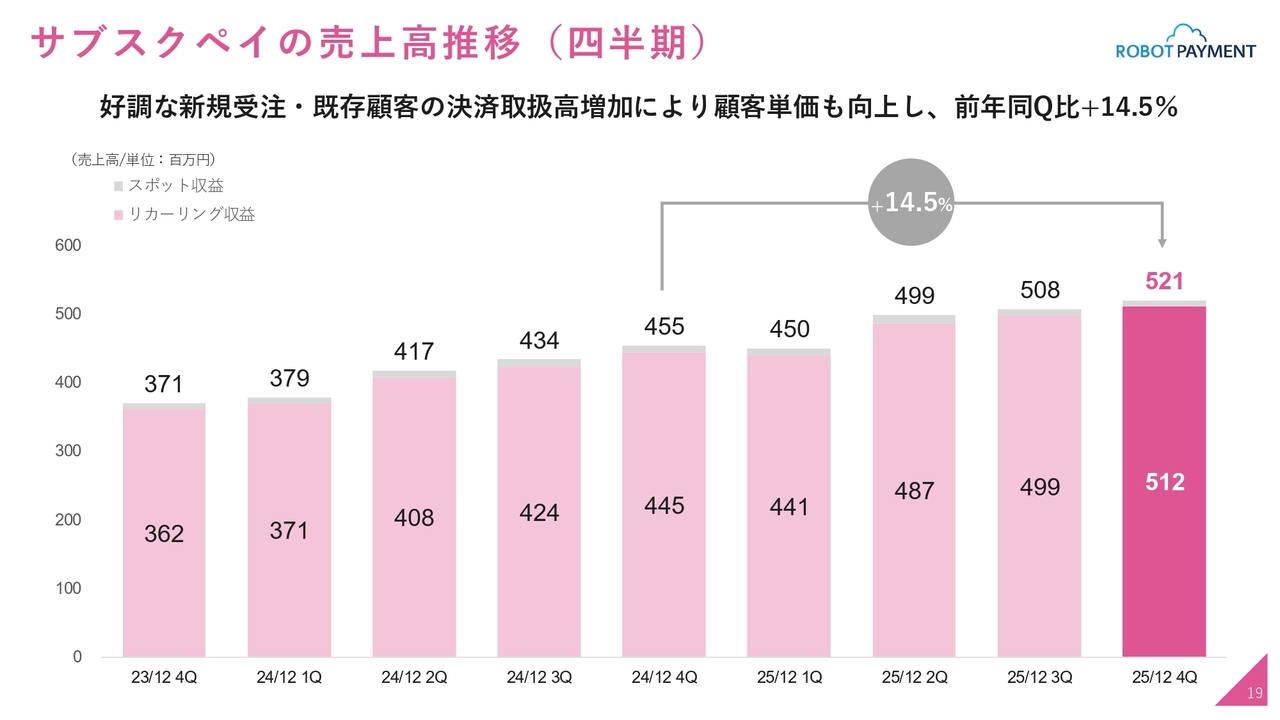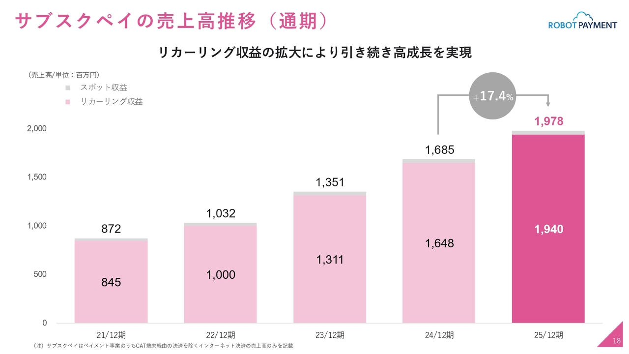 ピンク色のリカーリング収益が牽引するかたちで増収が継続、引き続き過去最高の売上を「サブスクペイ」としても更新しました。増収率は17.4パーセントで、売上高は20億円手前まで拡大しています。
