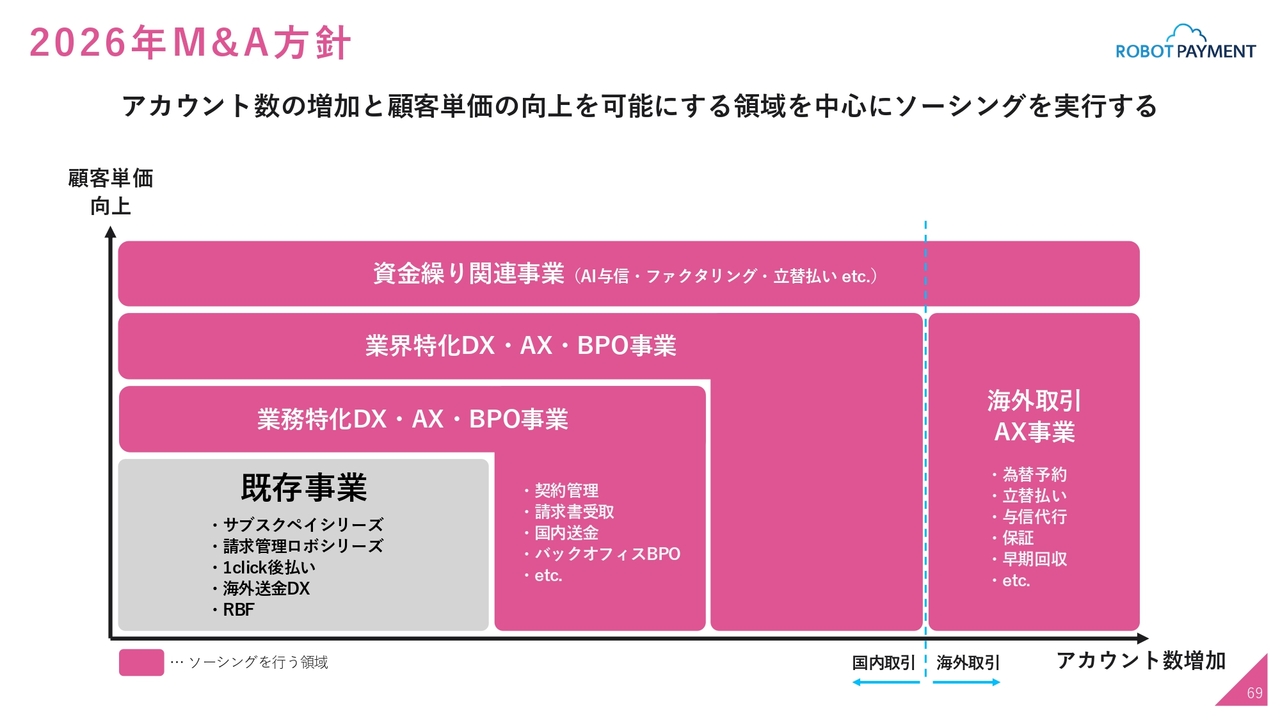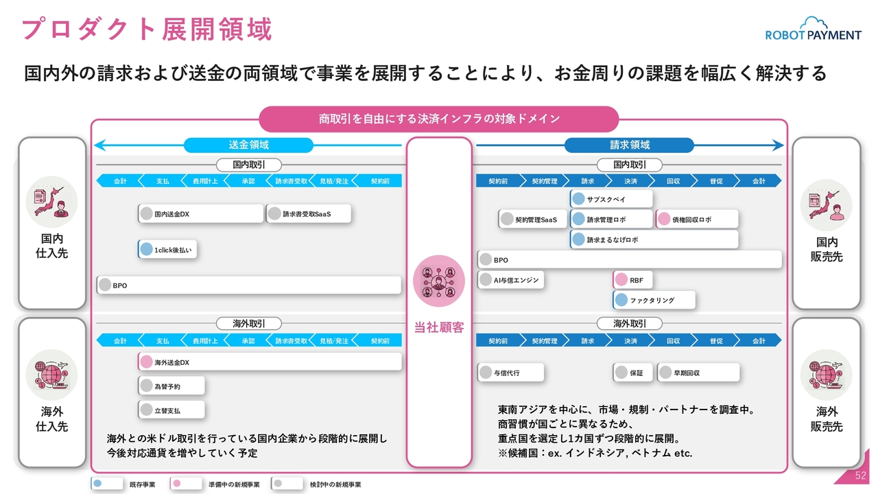 メイン事業は右上です。現在、国内での顧客による請求領域を構築しています。後ほどご説明しますが、今年は、左下の「海外送金DX」、右上の「RBF」および「債権回収ロボ」を対象とした新規事業を構築中です。