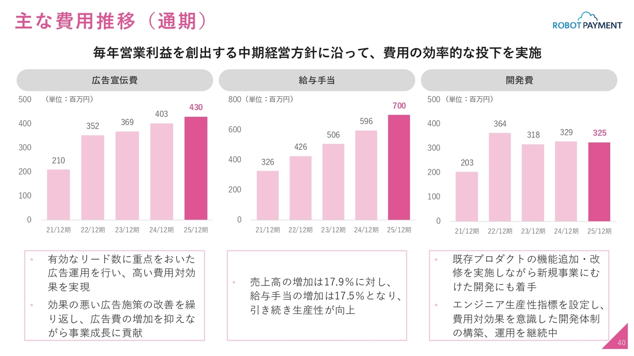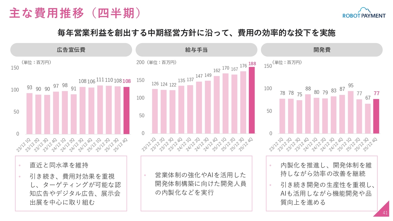 スライド右側は開発費の推移を示しています。お伝えしたとおり、内製化を積極的に推進しました。AIを導入する際には、社内の社員にしっかりと対応させることが重要だと考えています。AIを活用しながら新規プロダクトの開発を進めていきます。