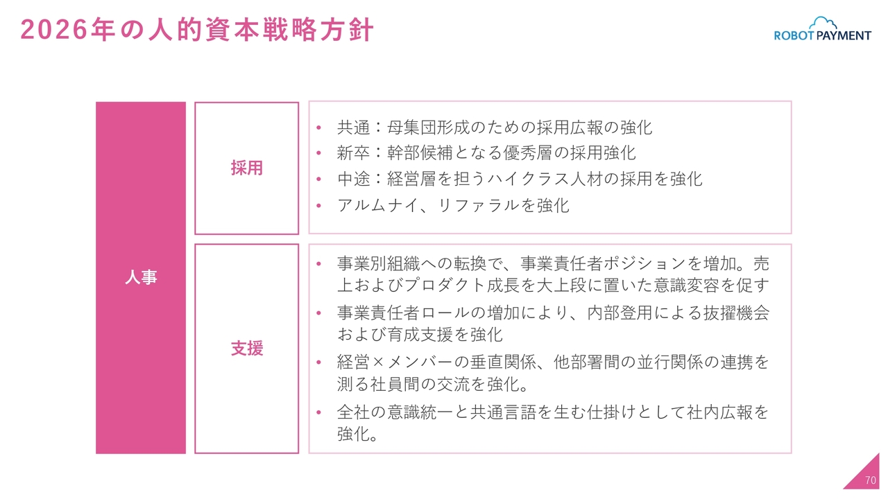 また、採用だけでは離職が増える可能性があるため、しっかりと支援します。要は育成していきます。この2つの軸で会社を強化していきたいと考えています。