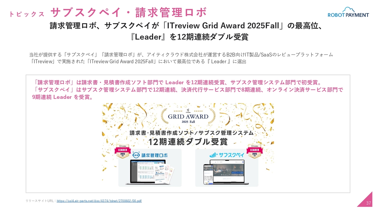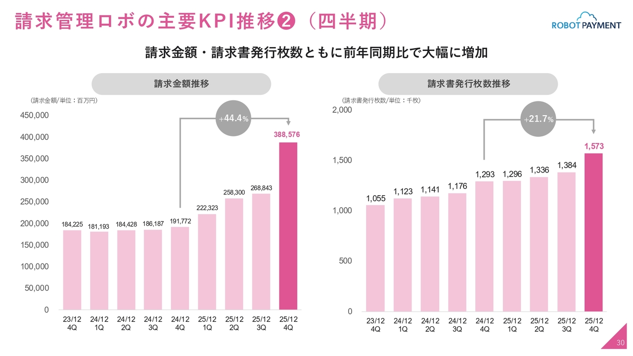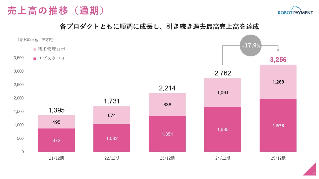 濃いピンク色の「サブスクペイ」と薄いピンク色の「請求管理ロボ」の両プロダクトともに順調に成長していることがご確認いただけるかと思います。