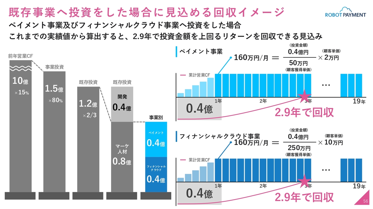 藤田:私から「既存事業の投資回収イメージ」についてご説明します。スライド54ページPhase1、Phase2、Phase3の計算式の一番左に、「アカウント数」と記載がありました。
