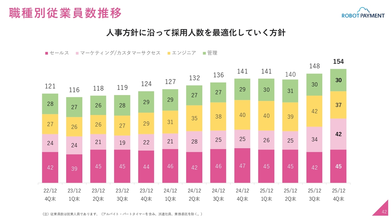 従業員数の全体の推移です。昨年の前半は採用にやや苦戦していた時期もありましたが、ハイクラス人員を含めて第3四半期から第4四半期にかけて採用が順調に進みました。
