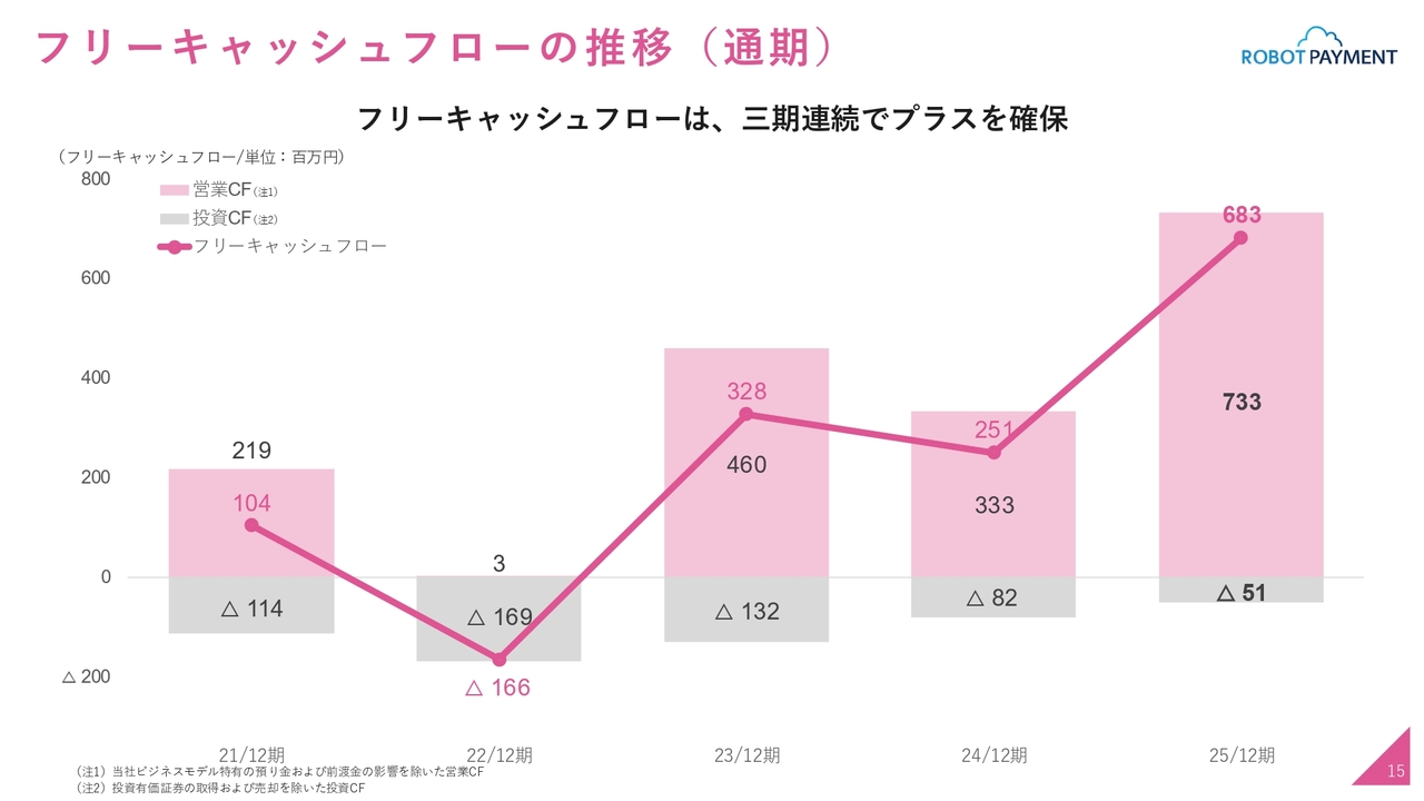 2023年、2024年、そして特筆すべき2025年において、一部法人税の入り繰りなどによりばらつきが見られるものの、フリーキャッシュフローの金額が大幅に増加していることが確認できます。