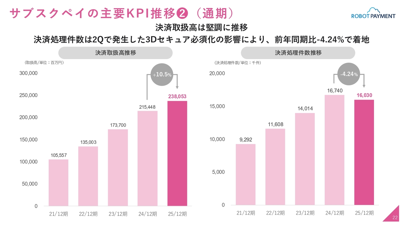 スライド右側は決済処理件数です。記載のとおり、「3Dセキュア」必須化の影響は一巡し、再び成長軌道に乗った状況です。