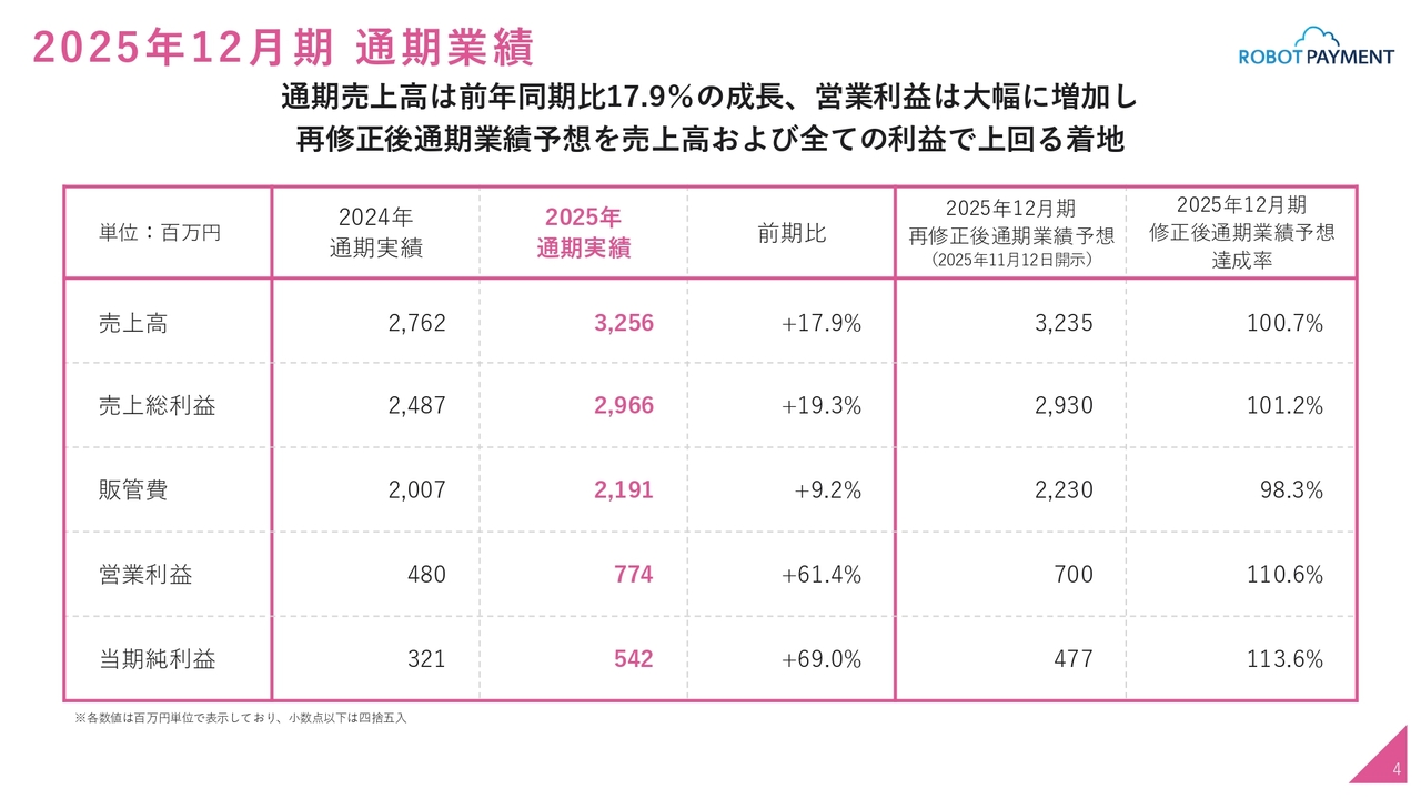 2026年2月12日に発表された、株式会社ROBOT PAYMENT2025年12月期決算説明の内容を書き起こしでお伝えします。