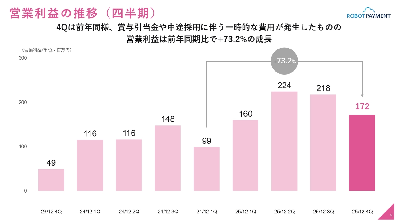 四半期別の営業利益の推移です。第4四半期では、前年と同様に一部引当金や採用が順調に進んだことによる一時的な費用の発生がありましたが、いずれも季節性の範囲内に収まりました。