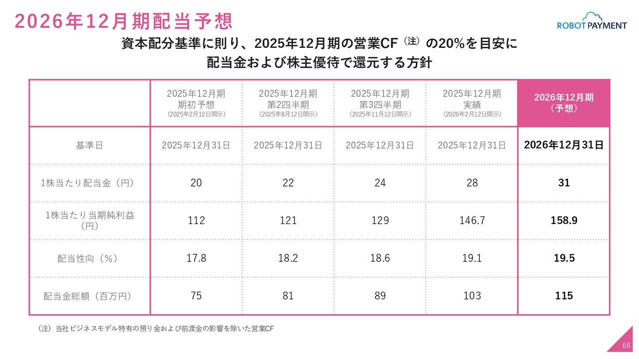 配当についてです。こちらも長期経営戦略でご説明した資本配分基準に基づくものです。2025年12月期の営業キャッシュフローの20パーセントを目安に、配当金および株主優待で還元する方針です。