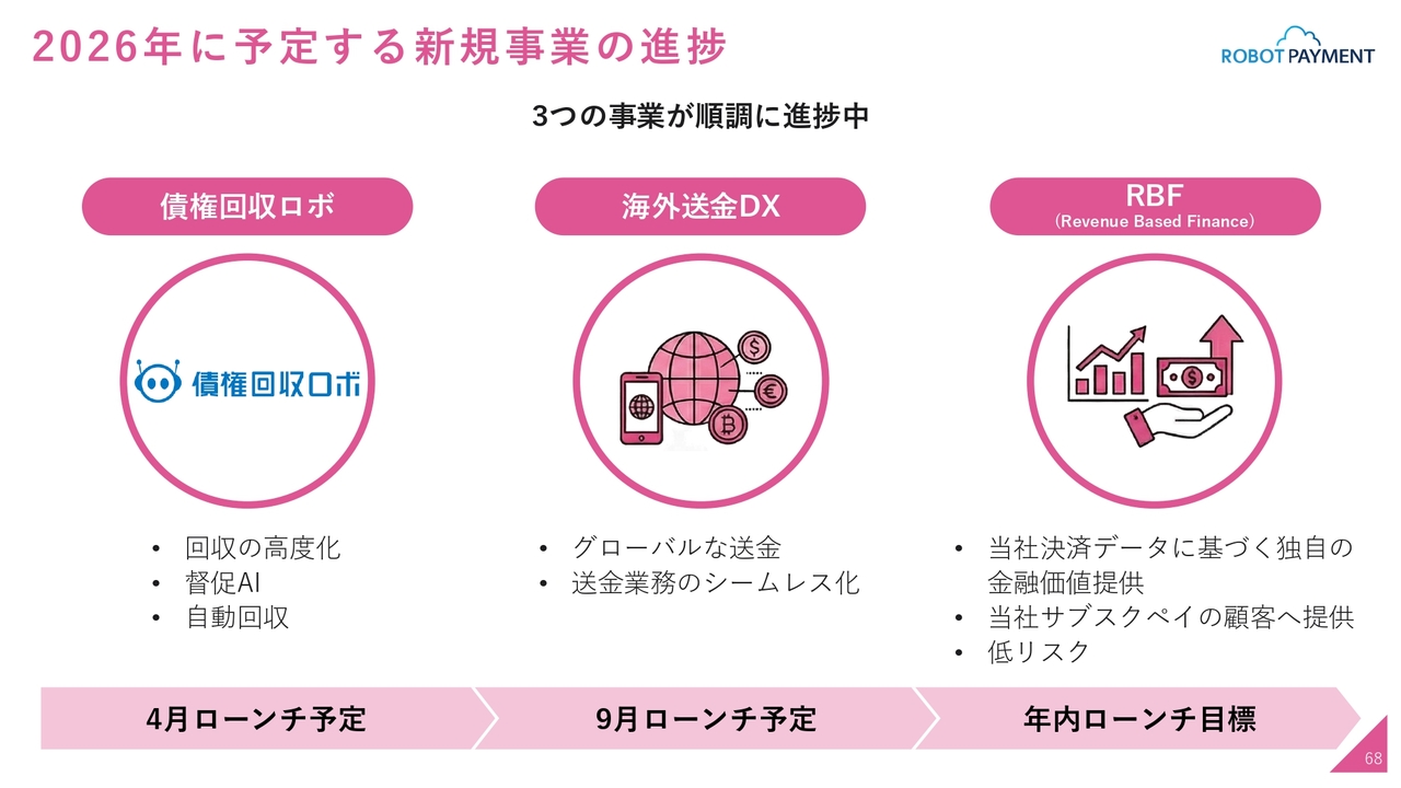 「債権回収ロボ」は4月、「海外送金DX」は9月に予定しています。「RBF」はリスクの部分もありますので、年内にはローンチしたいと考えています。楽しみにお待ちいただければと思います。