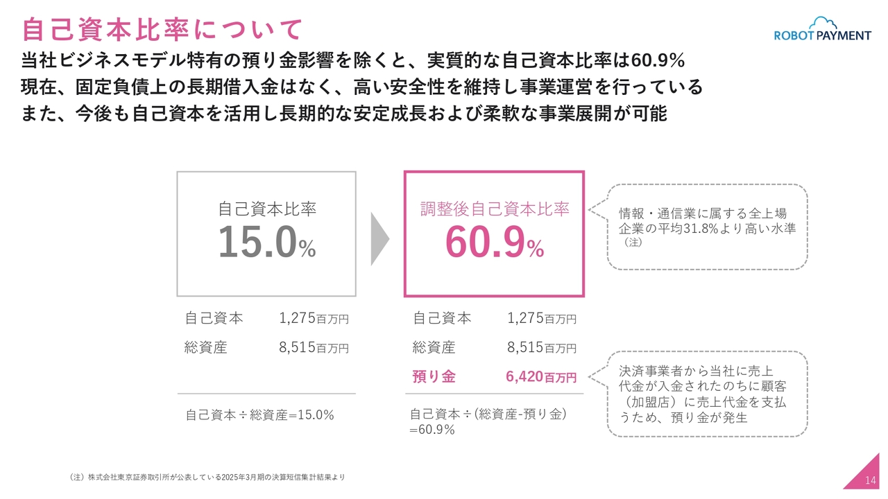 ただし、預り金を除いた実質的な実態を反映した自己資本比率は、60.9パーセントとなります。非常に高い自己資本比率であり、借入もない状態ですので、財務健全性には問題ないと考えています。