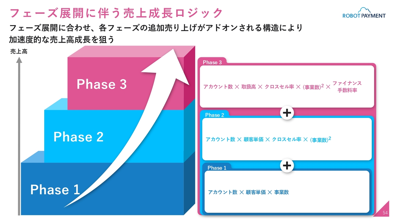 そして、現在の売上にアドオンしていく図です。Phase1・Phase2・Phase3というかたちで、乗数的かつ加速度的に売上高が成長していくことを示しています。その計算式については、右下のPhase1・Phase2・Phase3の四角の中に記載しています。