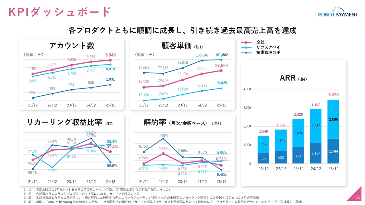 KPIダッシュボードです。今回から、過去からの推移を示しています。アカウント数、顧客単価、リカーリング収益比率、解約率、そしてARRですが、スライドに記載のとおり非常に順調で、トップラインは引き続き最高を更新しました。