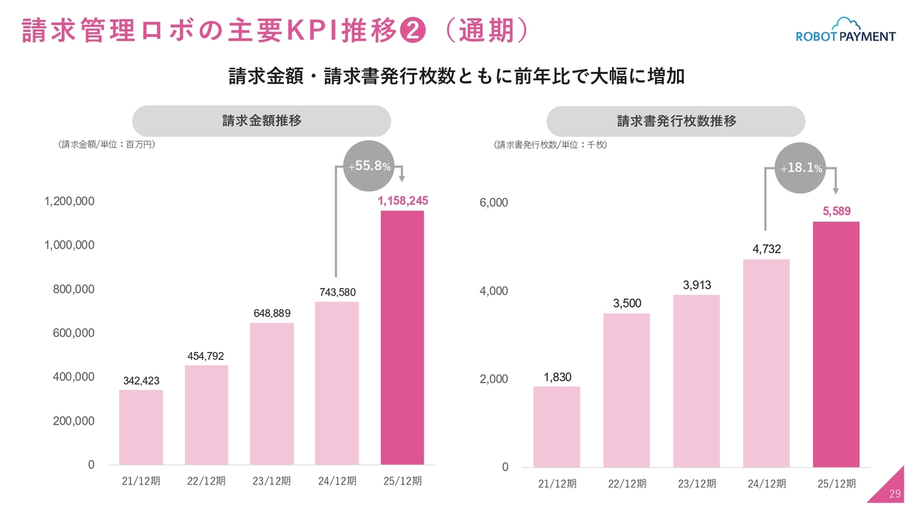 請求金額および請求書発行枚数のKPIについてですが、特に請求金額が大幅に伸びています。2025年には大手顧客の受注や稼働が複数あり、それが請求金額および発行枚数に反映されている状況です。