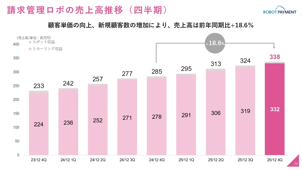 同じように、「請求管理ロボ」についてご説明します。まず、年度ベースの売上です。「請求管理ロボ」の売上は引き続き成長しており、前期比19.6パーセント増と高い成長が継続しています。
