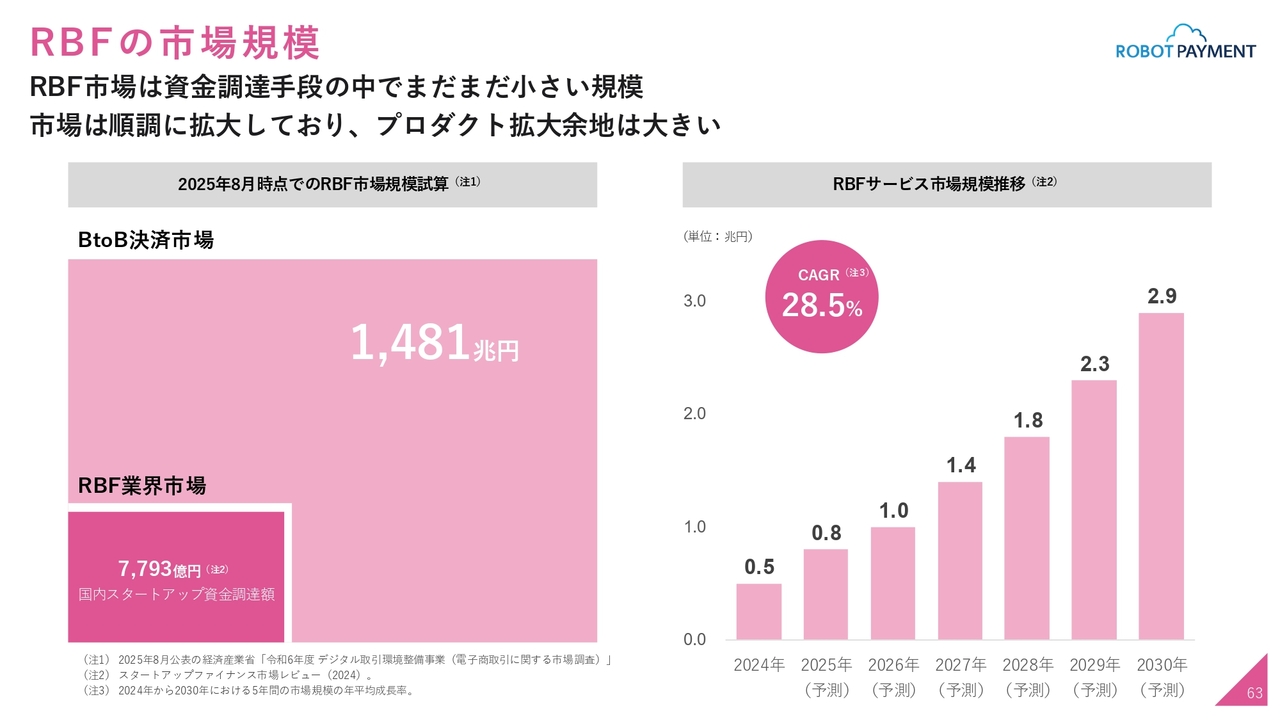 ただし、「ファクタリング」などの成長や、右側のグラフにあるように、BtoB決済市場のCAGRが28.5パーセントと急激に伸びていることから考えると、市場全体が5パーセントや10パーセントの成長にとどまる中で、非常に高い成長性を示しています。