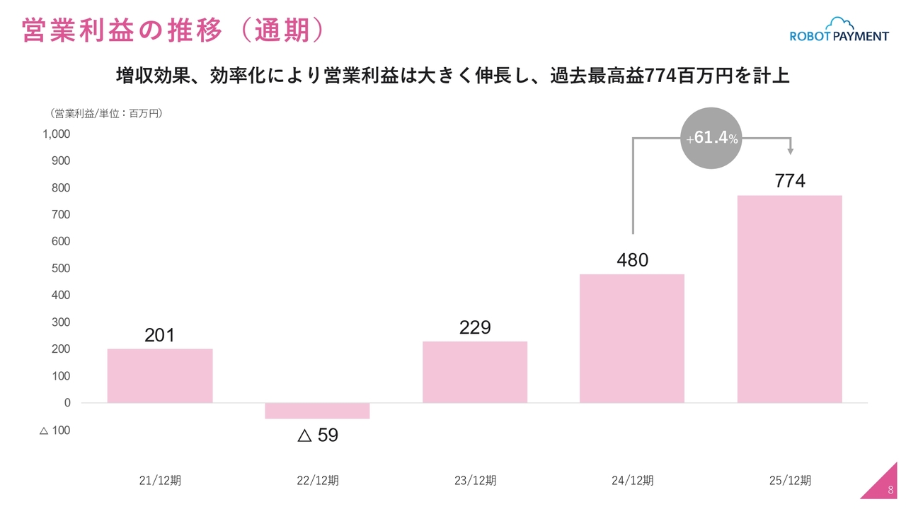 年間営業利益の推移です。こちらも大幅な増益で着地しています。営業利益は7億7,400万円で、増益率は61.4パーセントと非常に高い結果となりました。増収効果や効率化の取組みが営業利益の大幅な伸びに寄与しています。