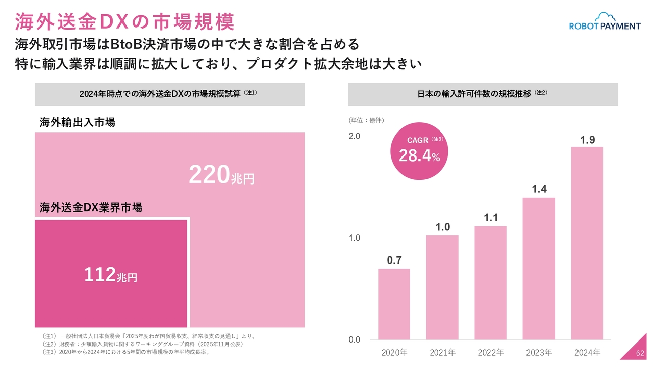 この輸入許可件数は増加しており、1.9億件となっています。この5年間で倍以上に輸入が増加しており、それに伴い送金が増加しています。そのため、非常に高いCAGRに挑戦していこうと考えています。
