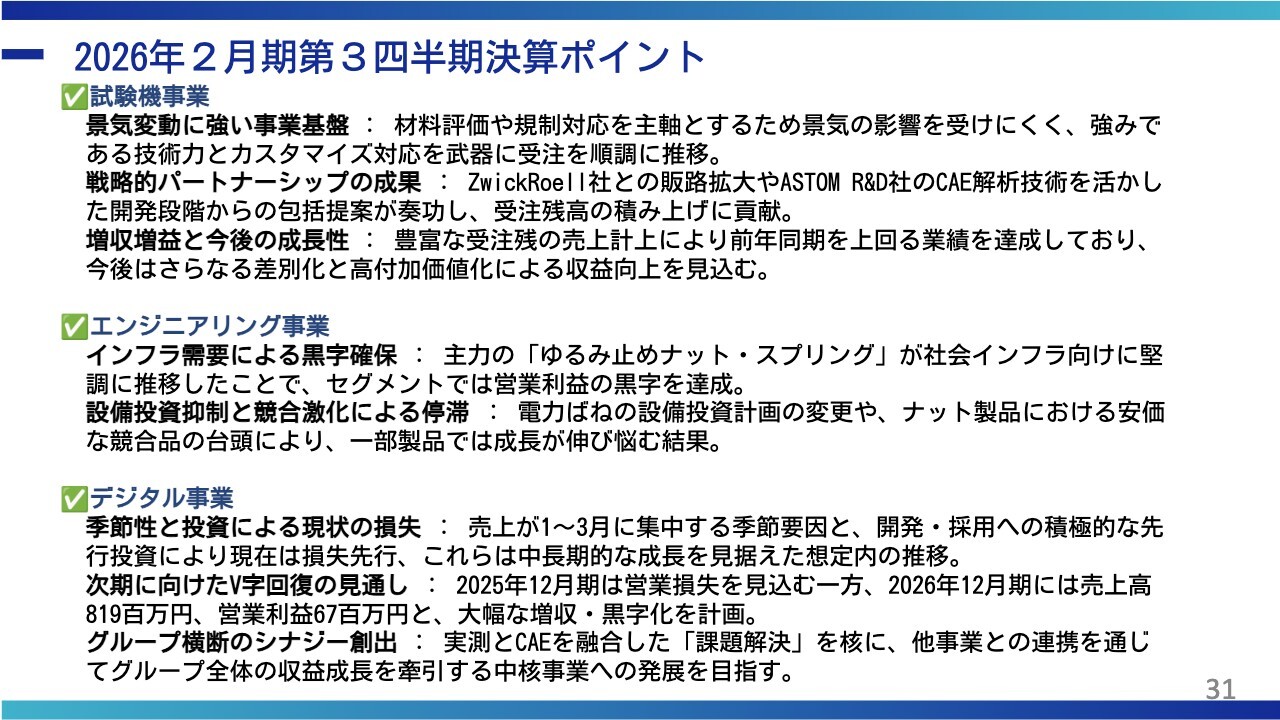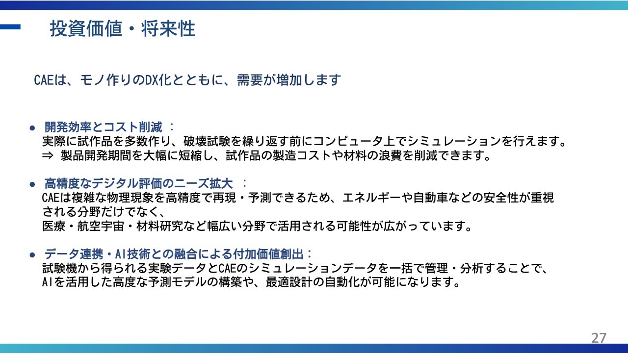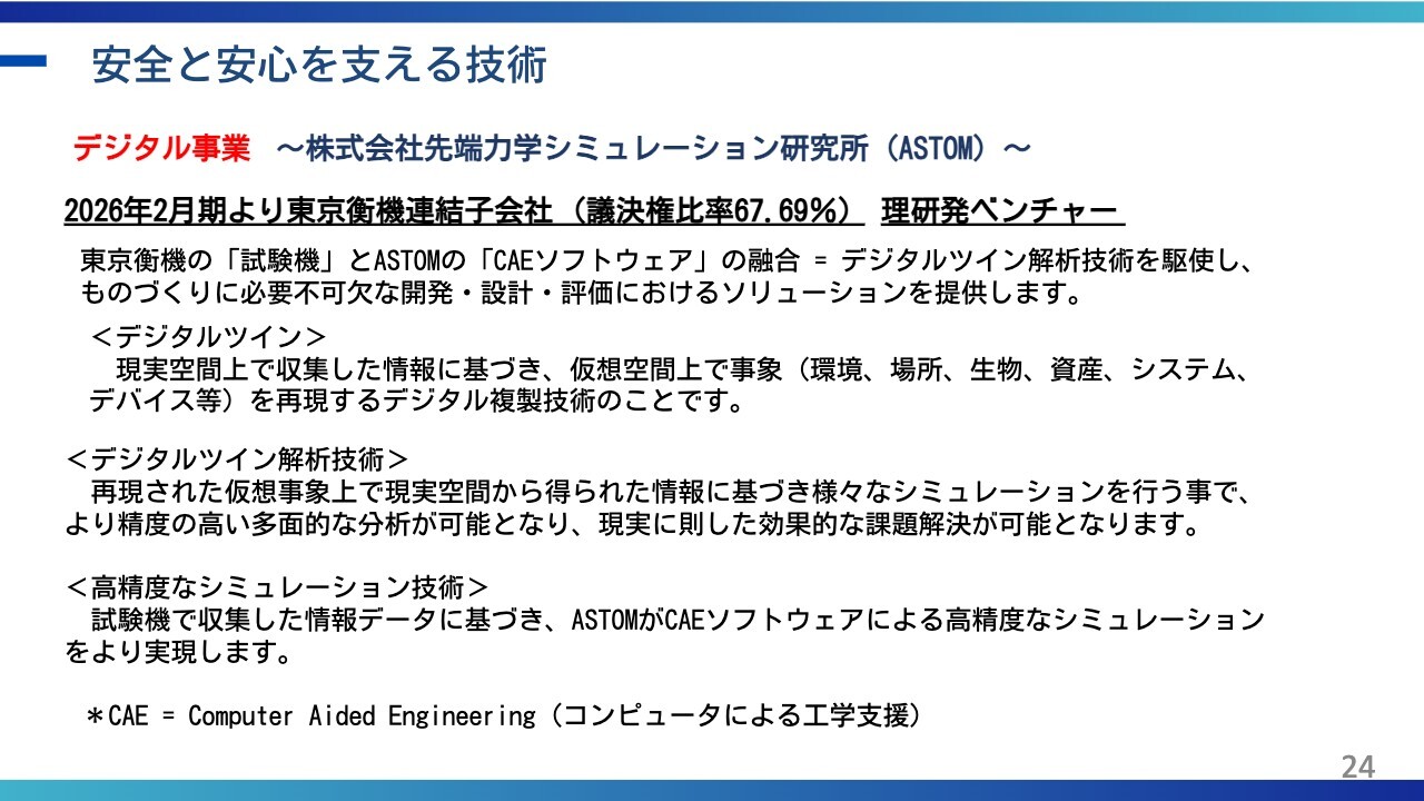 回答:当社は試験機事業に加え、CAE解析を中心としたデジタル事業(ASTOM R&D社)とのシナジー創出の具現化に取り組んでいます。