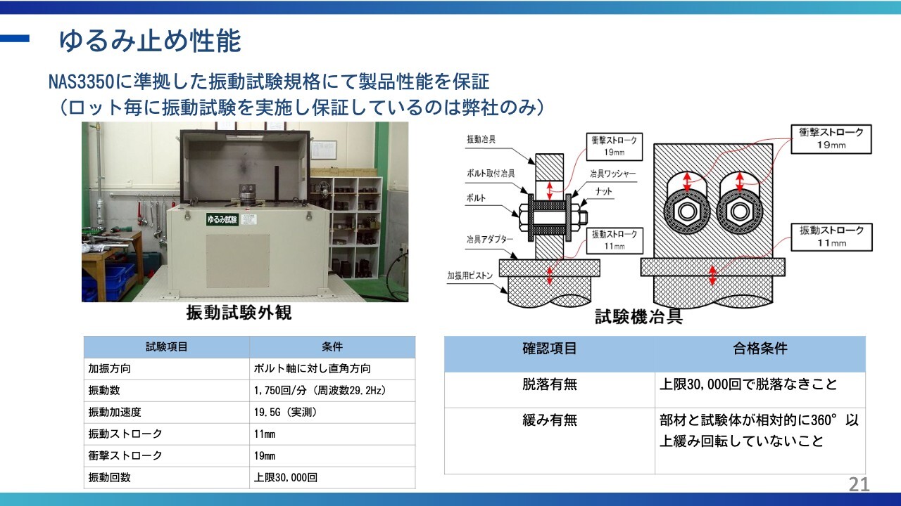小塚:「どのくらい緩まないか」という点についてです。スライドに記載の「NAS3350」というのは専門的な内容になりますが、アメリカの規格のことで、非常に厳しい基準となっています。