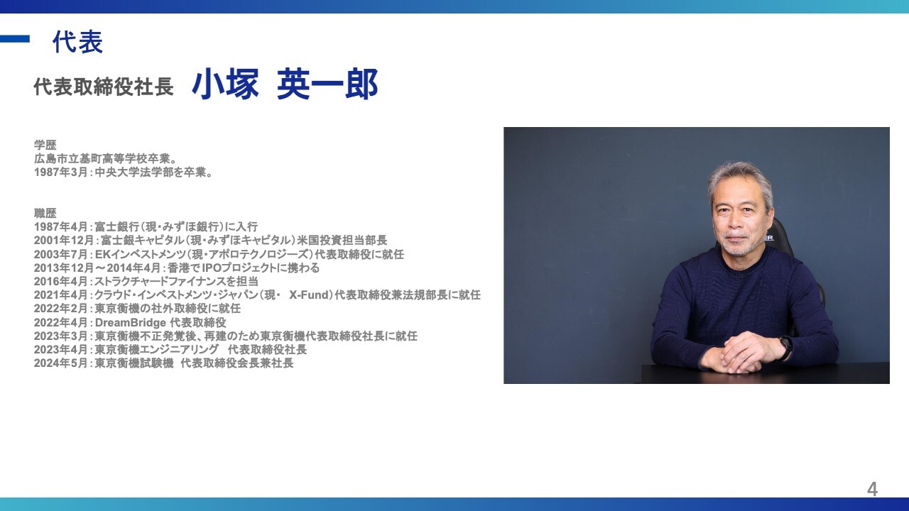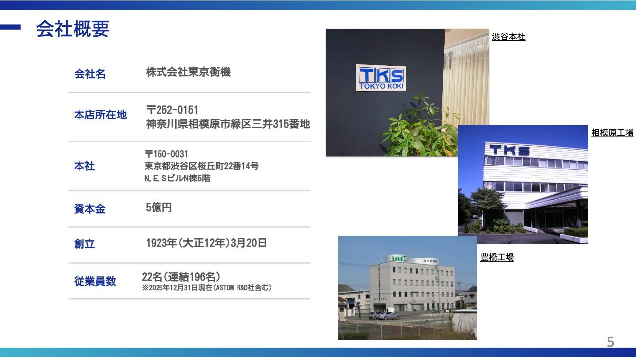 小塚英一郎(以下、小塚):株式会社東京衡機 代表取締役社長の小塚と申します。本日は、事業内容と業績について簡単にお話しします。