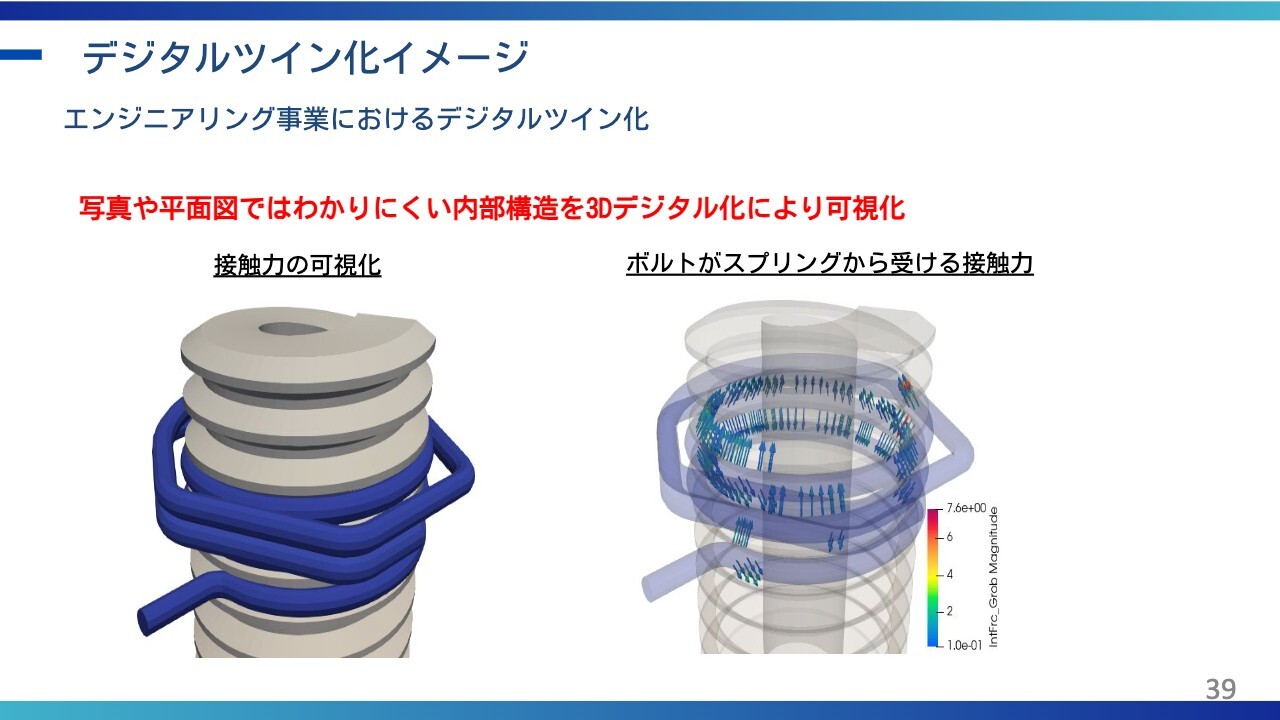 小塚:スライドはイメージ図になります。このスプリングは左側の図のようになっており、一見わかりにくいかもしれません。しかし、ASTOMの技術を活用すると、右側の図のようにどこに圧力がかかっているのかを確認することができます。