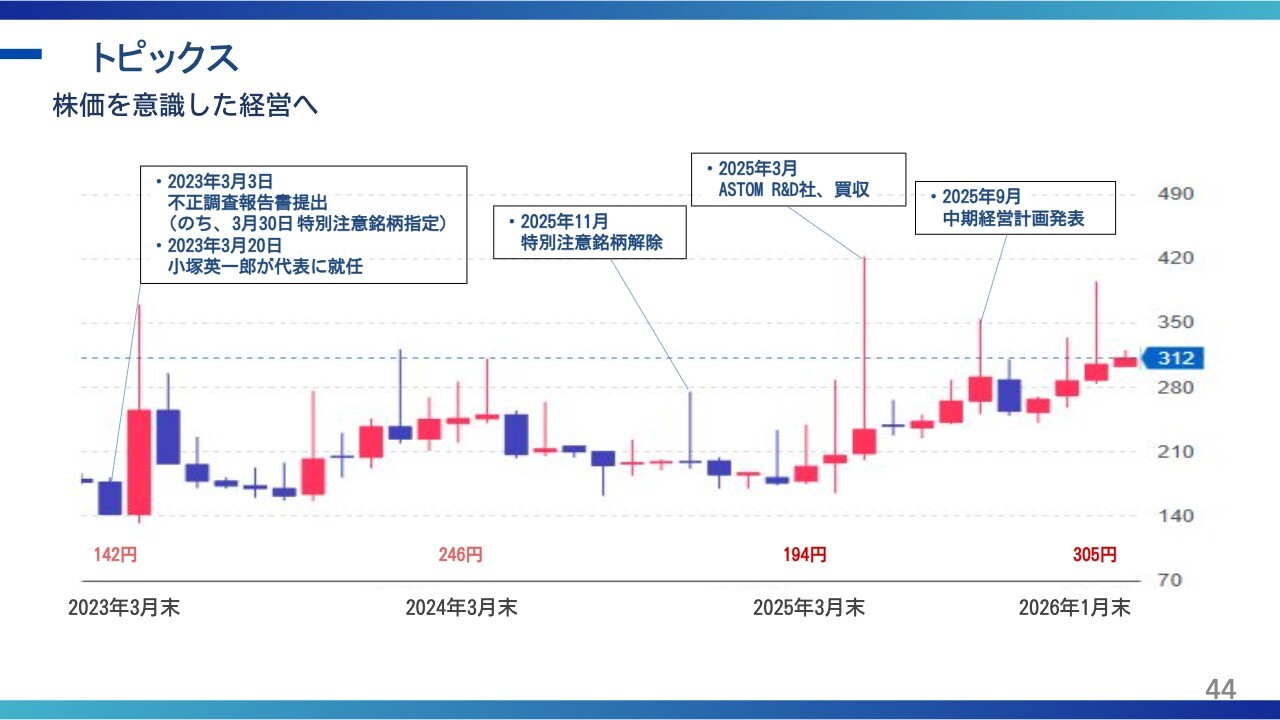小塚:PBRと株価の推移です。スライドにもあるとおり、株価は142円から始まり、私が就任してから倍以上にはなりました。ただ、まだまだ低い水準と考えていますので、来年、再来年に向けてさらに向上を目指したいと思います。