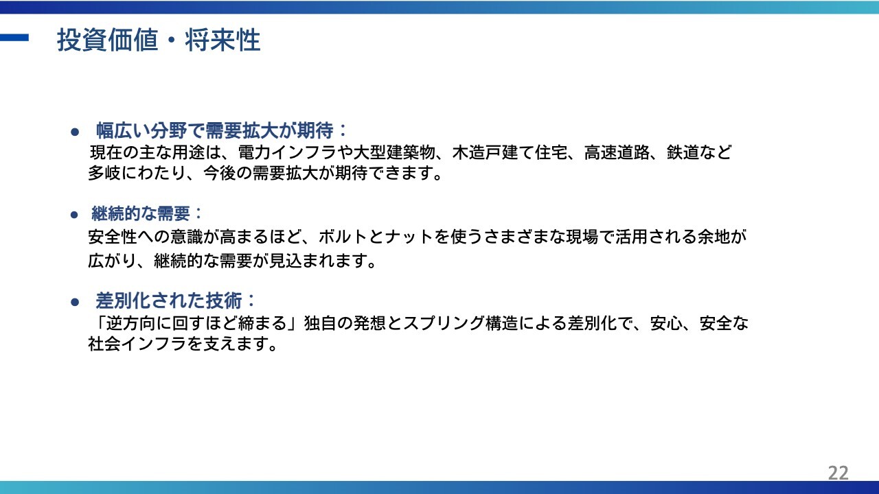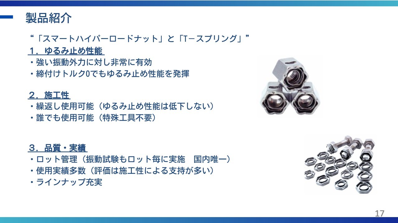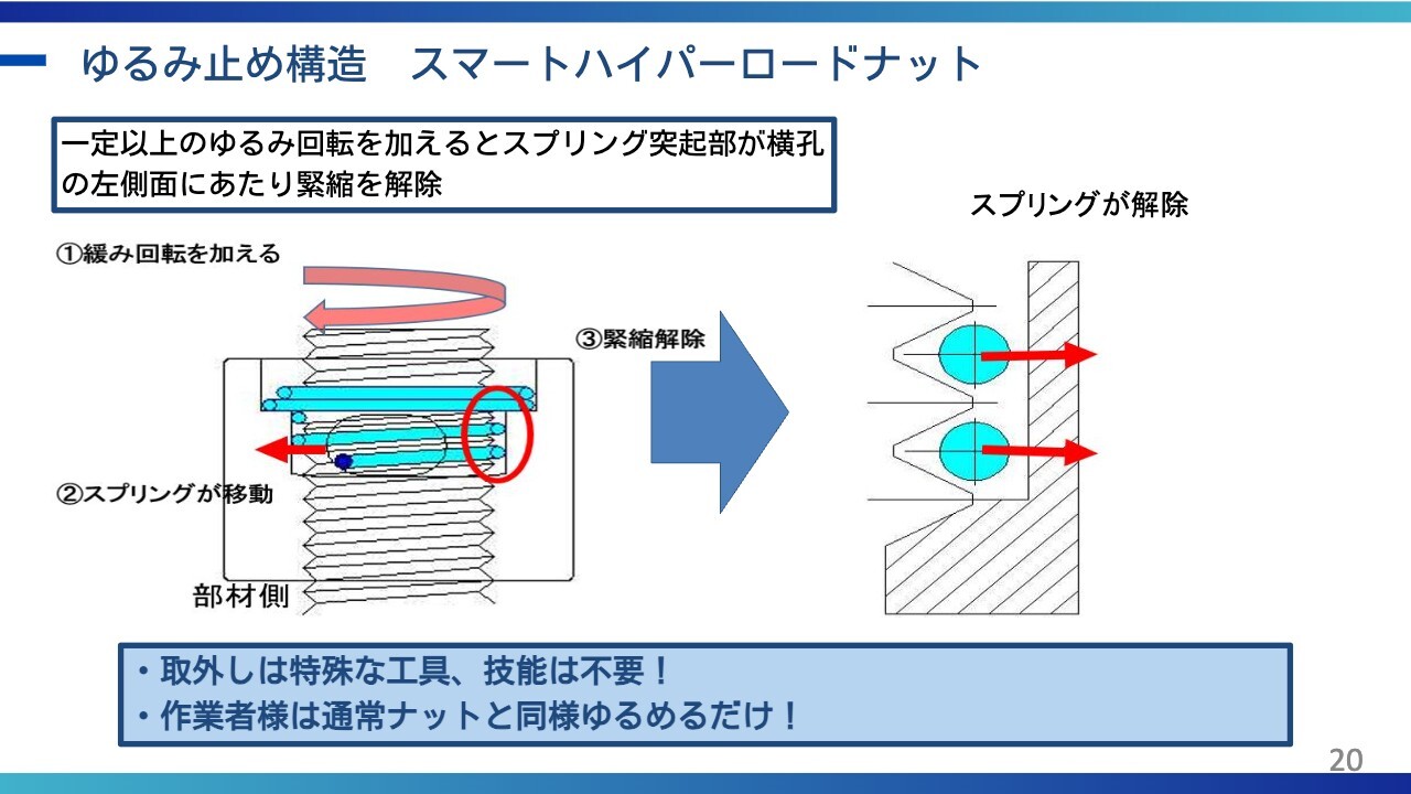 スライドの3つ目に「差別化された技術」と記載がありますが、逆方向に回すほど締まる構造となっており、従来の「ゆるまないナット」とは構造的にまったく異なるものだと認識していただければと思います。
