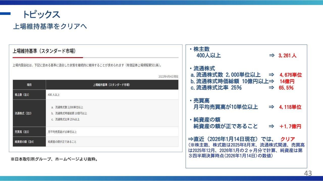 小塚:上場維持基準については、昨年一部基準に抵触しましたが、現在はすべてクリアしており、問題ありません。