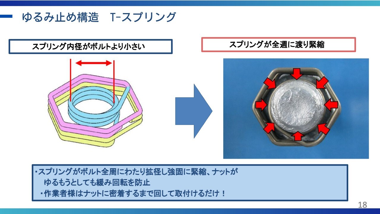 小塚:スライドに示したように、巻き付いた状態で、さらに振動があっても締まる方向にしか動かないことが、当社のナットの特徴です。