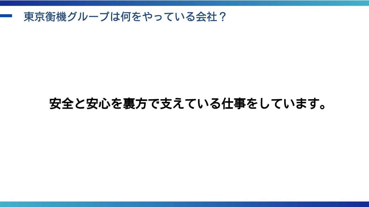 小塚:この3社の名前を聞いても、なかなか馴染みがないと思います。「東京衡機グループは何をやっている会社か?」という質問に対する答えとして、「安全と安心を裏方で支えている仕事をしています」というのが一番わかりやすい表現かと思います。