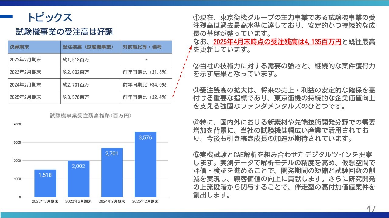 塩谷:試験機事業の受注が非常に好調というご説明でしたが、新規受注額が2025年4月時点で約41億円とのことです。この要因として、新規クライアントが増えているのか、それとも1社当たりの受注金額が上がっているのか、どちらでしょうか?