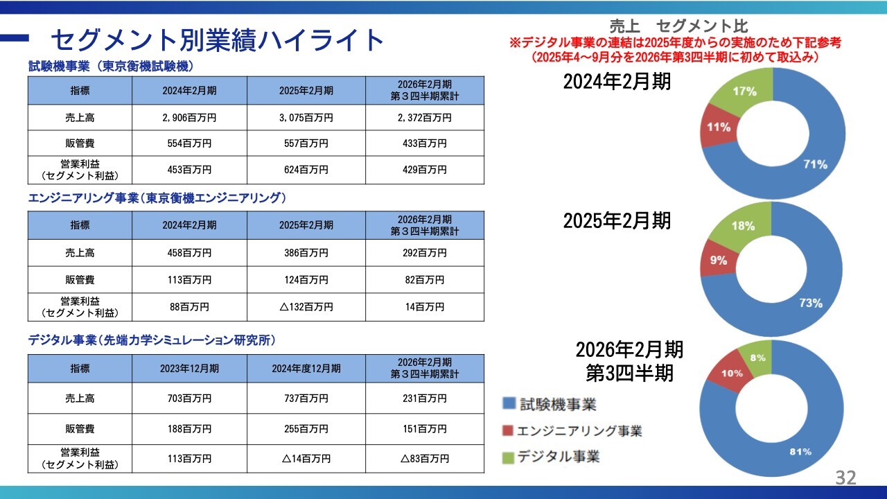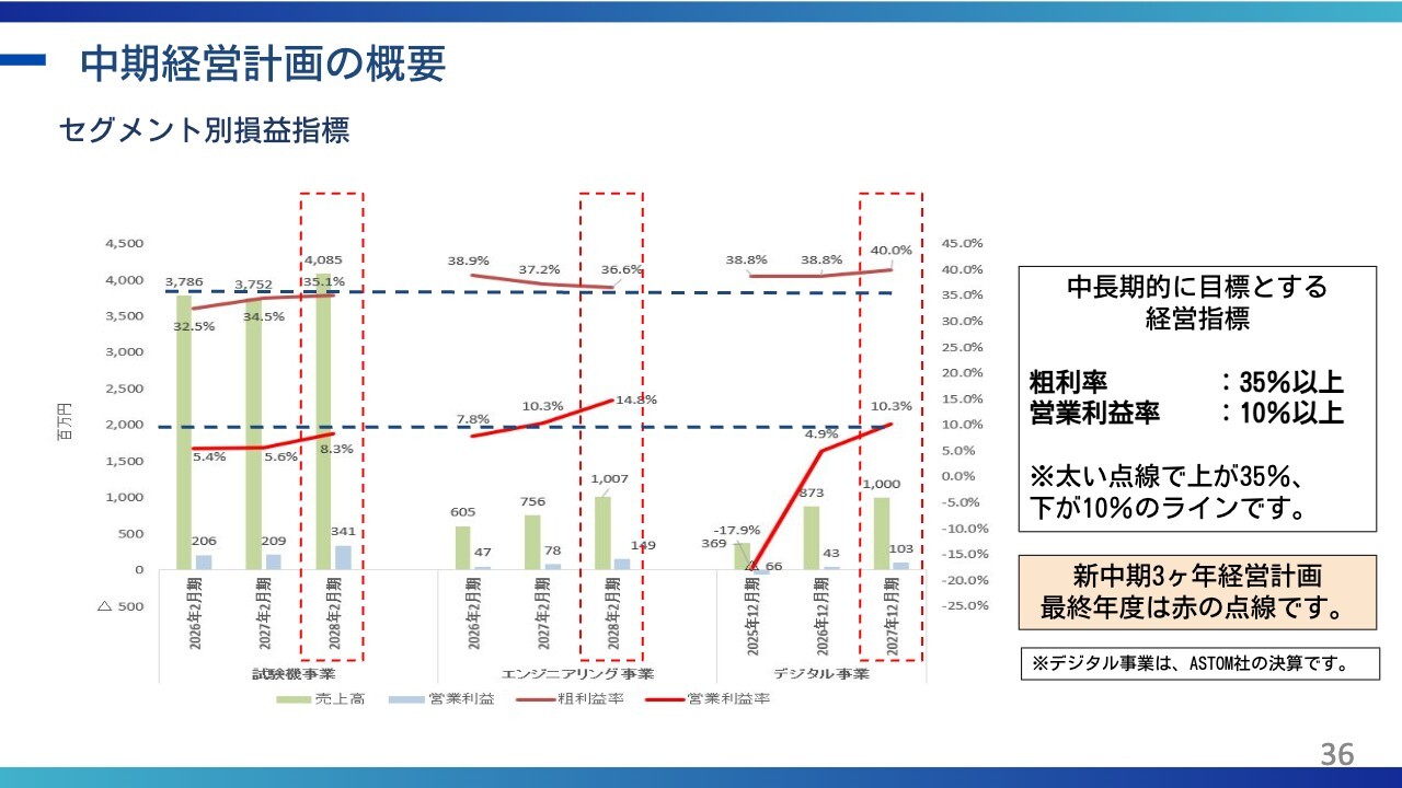 回答:当社の収益基盤は試験機事業であり、同事業で獲得する各受注の質の改善および原価低減努力による採算性の向上等が営業利益率向上に最も寄与すると考えています。加えて、試験機事業とデジタル事業のシナジーによる付加価値の高い案件創出を進めており、中長期的には収益性向上に寄与することを見込んでいます。