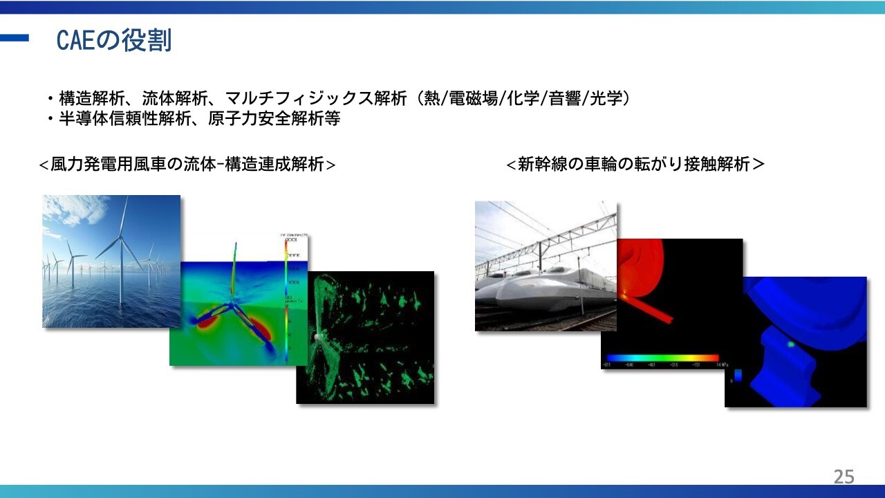 小塚:CAEの役割は、スライドに記載のとおりです。スライド左側の写真は風力発電用風車です。実際にどのような風を当てたらどう負荷がかかるのかを、コンピューター上でシミュレーションしています。