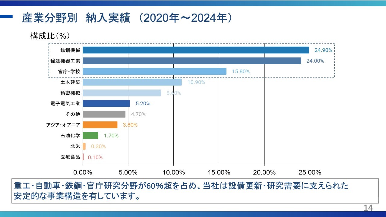 小塚:産業分野別の納入実績については、スライドに記載のとおり、鉄鋼機械や輸送機器工業が非常に大きなシェアを占めています。