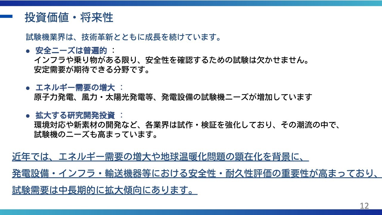 そのため、素材が変化するほど試験のニーズは高まり、基本的にこのニーズはしばらく継続すると考えています。