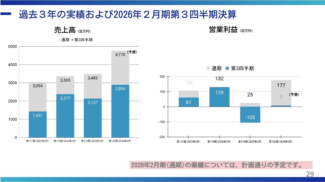 小塚:業績ハイライトについてお話しします。私が着任したのは2023年3月で、当時の事業規模は約30億円でした。今月末で2026年2月期第120期が終了しますが、予想としてはスライドに記載のとおり47億7,000万円となり、50億円にかなり近い状況です。