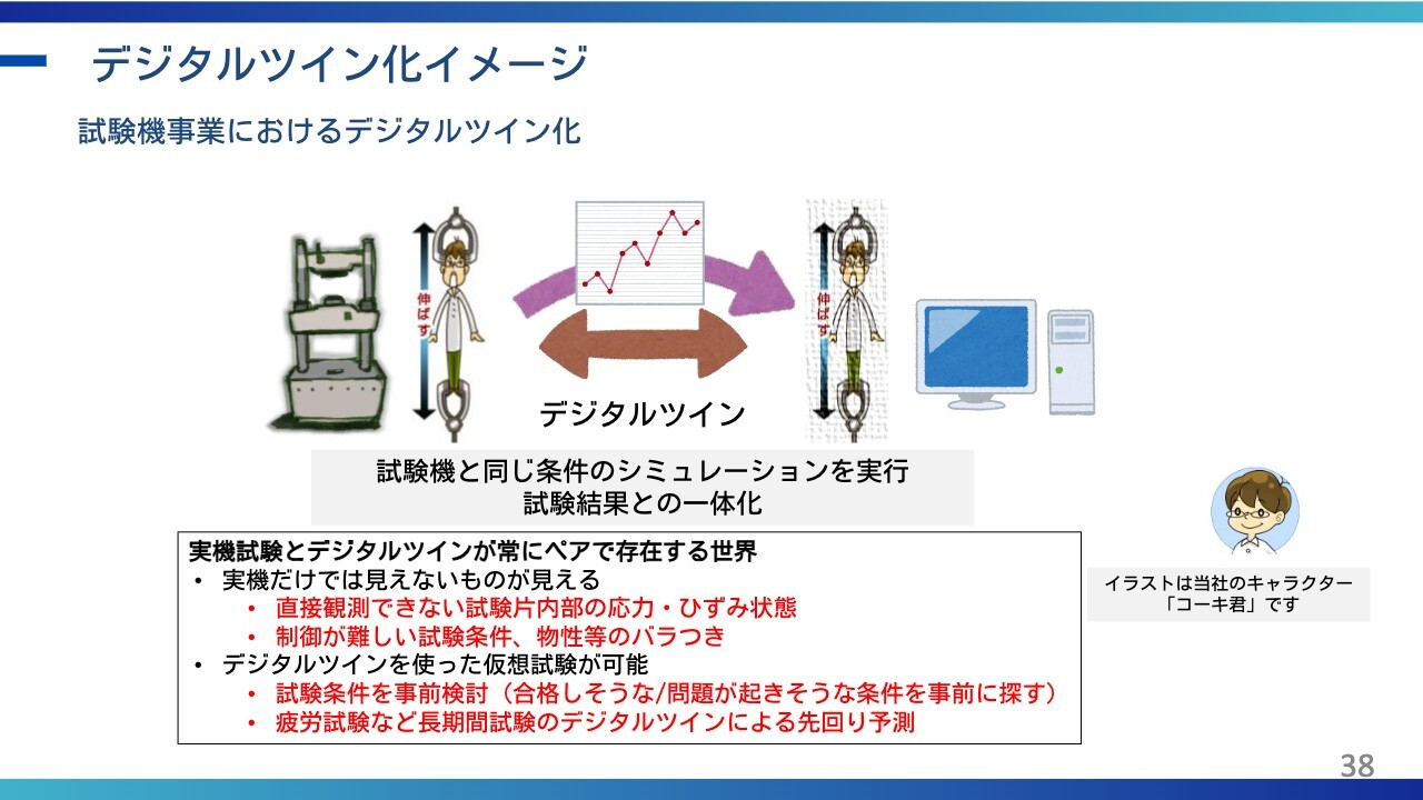 小塚:最後に、先端力学シミュレーション研究所のデジタル事業についてです。昨年2月に連結子会社化し、特に「試験機」と「CAEソフトウェア」を融合したデジタルツインの推進を目指しています。