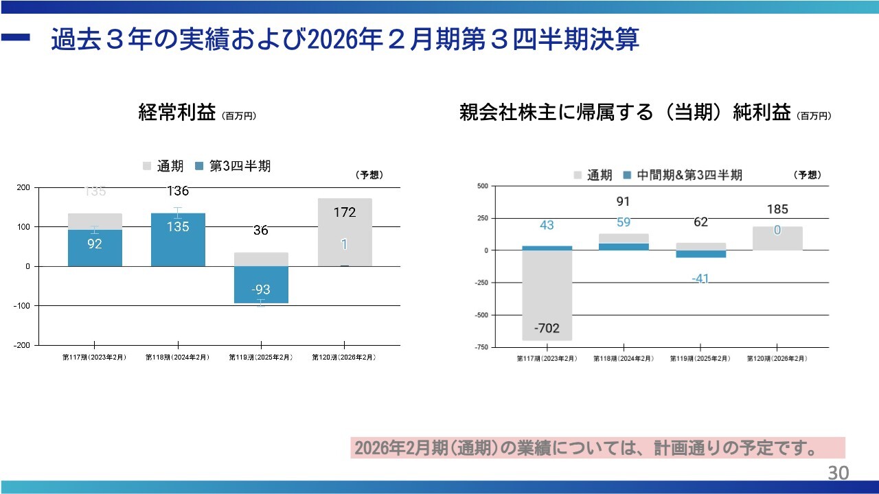 過去3年の実績および2026年2月期第3四半期決算