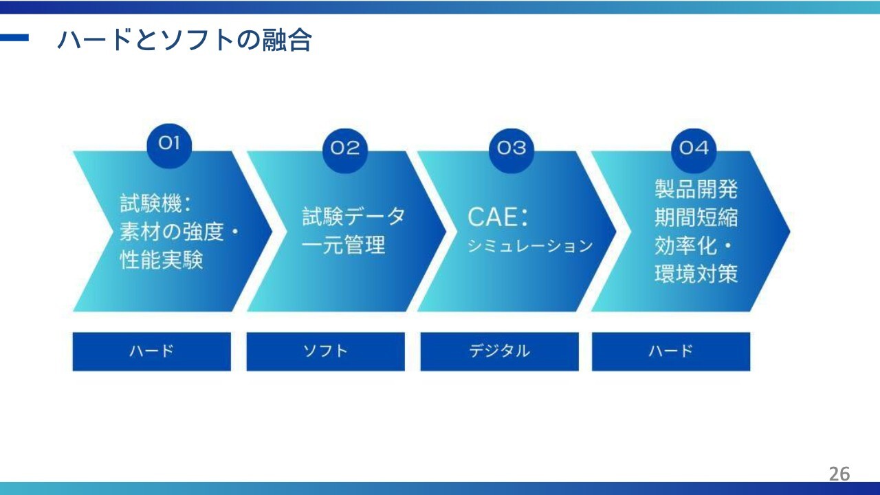 具体的には、「試験機による実機試験(ハード)」「CAE解析によるシミュレーション(ソフト)」「試験データの解析および活用(サービス)」の3つを融合することで、開発効率向上および顧客の付加価値向上に貢献するソリューション提供を推進していきます。