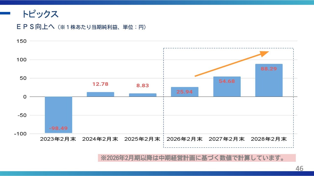 塩谷:多くのご質問をいただいており、注目度の高さを感じています。「配当の再開時期について、開示ベースで2029年2月期というかたちで出されていますが、途中での純資産の積み上げやキャッシュフローの観点から、より早期の還元は検討できないのでしょうか?」というご質問です。